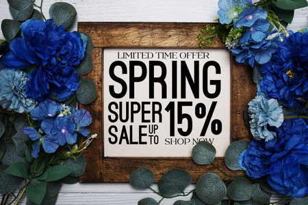 Spring Sale 15% Promotion and Marketing with flowers bouquet decoration on wooden background