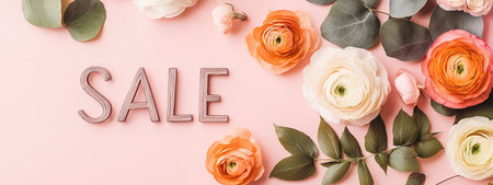 top view of sale lettering banner near ranunculus flowers on pink background, panoramic shot