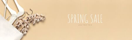 Creative spring sale concept. White wooden hangers with spring flowers white paper bag on beige background top view flat lay. Fashion spring discounts shopping sale store promo design minimalism style.