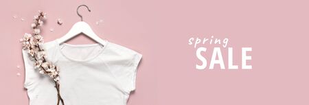 Spring sale concept. White blank women's t-shirt spring twigs of flowers white wooden hangers on pink background flat lay top view. T-Shirt Mock-up. Women's clothes fashion discounts store advertising.