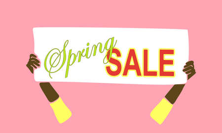 Spring sale banner. Black hands hold long poster with text Spring Sale isolated on bright pink background, Vector illustration