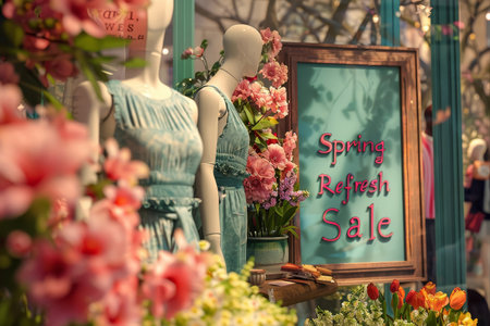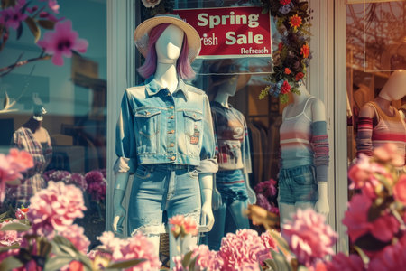Mannequins dressed in spring attire showcased amidst a floral setting. The storefront scene exudes a refreshing vibe, inviting onlookers into the season's trends