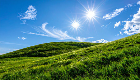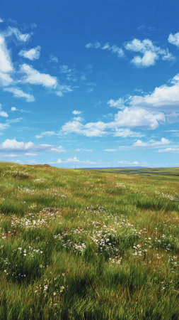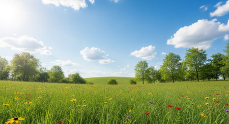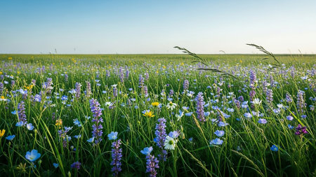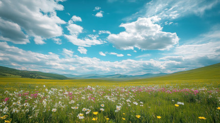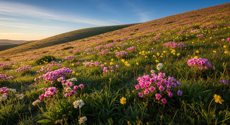 Cinematic view of rolling hills adorned with vibrant wildflowers under a clear sky