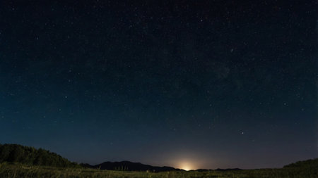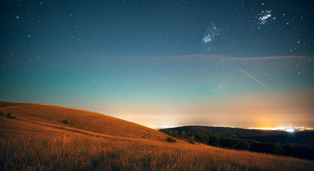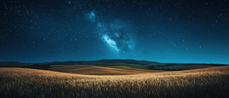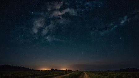 Night sky with stars and milky way over the field. Long exposure photograph.