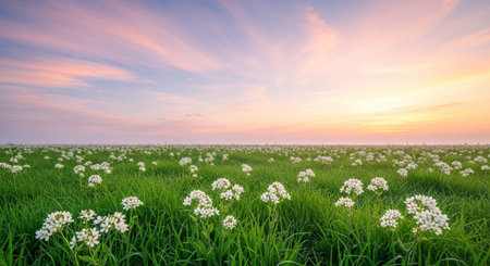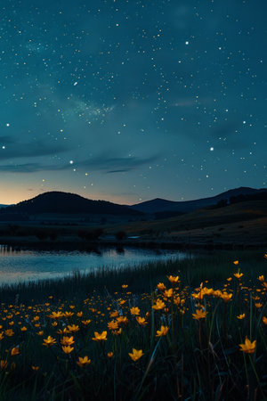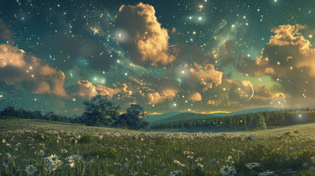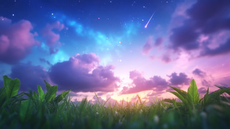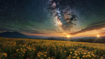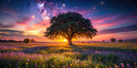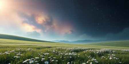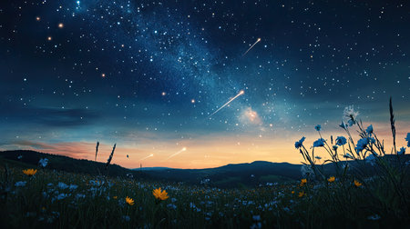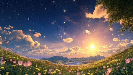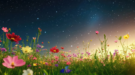 A peaceful meadow filled with colorful wildflowers under a stunning twilight sky, showcasing stars and vibrant clouds.