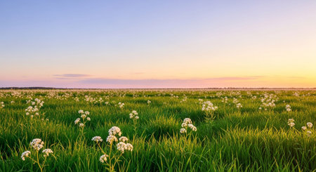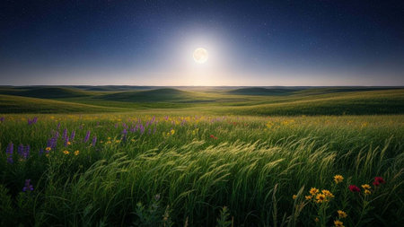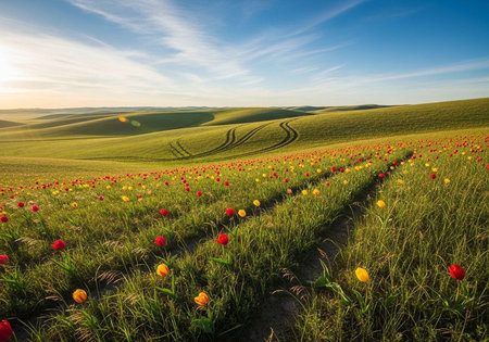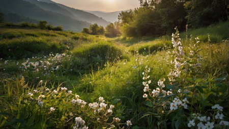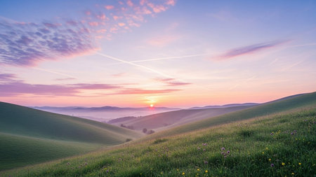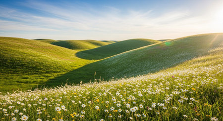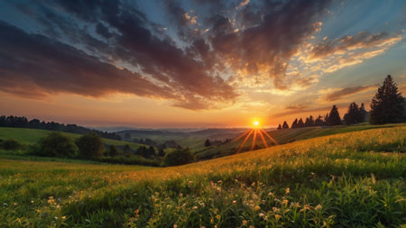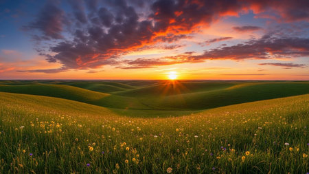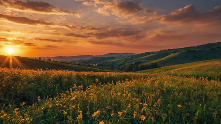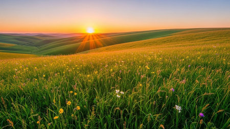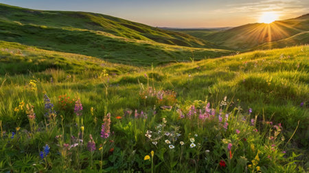 Cinematic view of rolling green hills adorned with vibrant wildflowers at golden hour