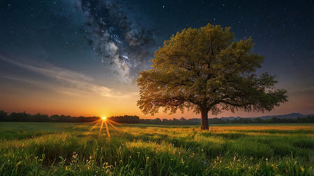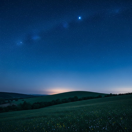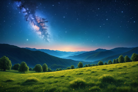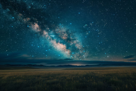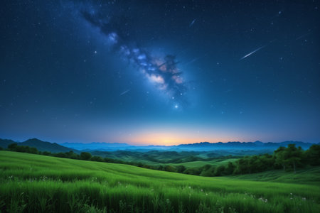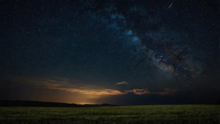 Stunning night sky view of the Milky Way over a vibrant green field.