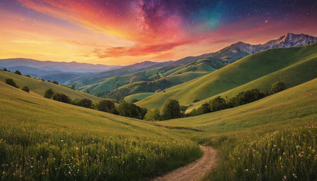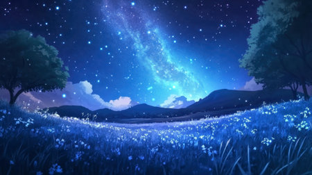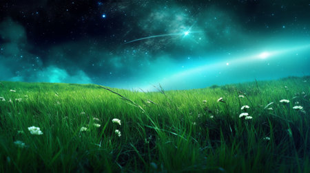 Cinematic view of a field at night illuminated by a starry sky and vibrant colors