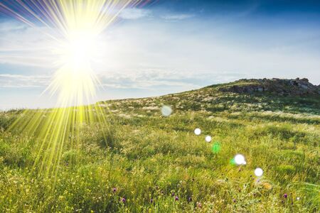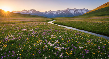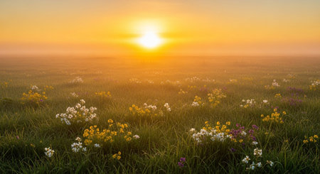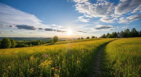 Sunlit meadow with vibrant wildflowers at sunset. Peaceful, idyllic scene.