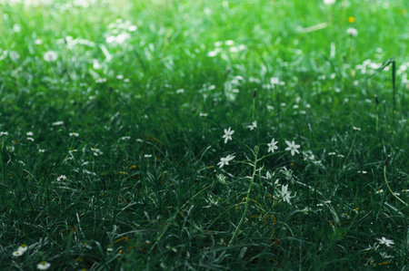 Top view of small white flowers in green grass. Natural floral background. The basis for the postcard.