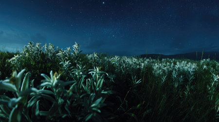 A panoramic wide view of Edelweiss field growing closely together under a clear night sky starlight illuminating leaves soft shadows calm natural atmosphere ultra realistic photography cinematic wide composition lifelike natural scene