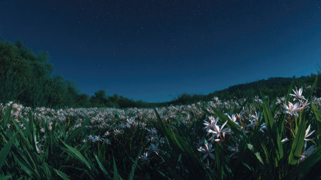 A panoramic wide view of Gaura field growing closely together under a clear night sky starlight illuminating leaves soft shadows calm natural atmosphere ultra realistic photography cinematic wide composition lifelike natural scene