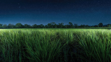 A panoramic wide view of paddy field growing closely together under a clear night sky starlight illuminating leaves soft shadows calm natural atmosphere ultra realistic photography cinematic wide composition lifelike natural scene