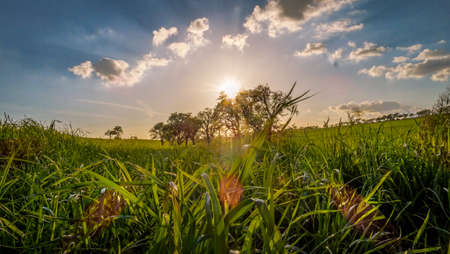 Sunset in Tuscany, Italy. Panoramic view of the spring meadow.