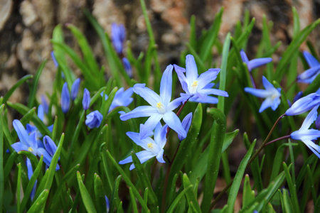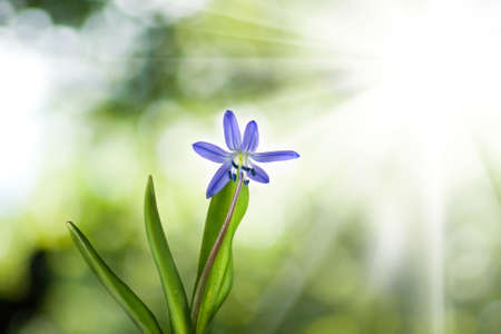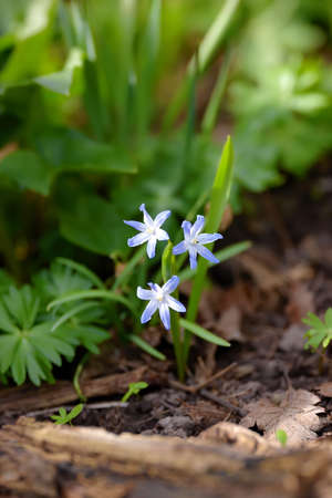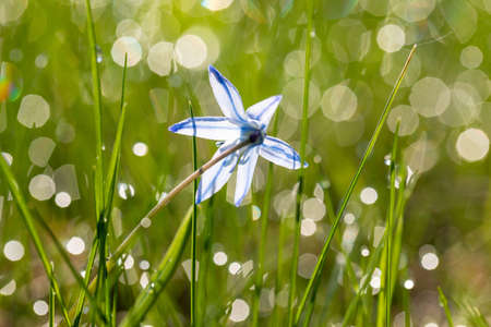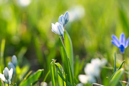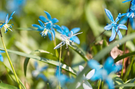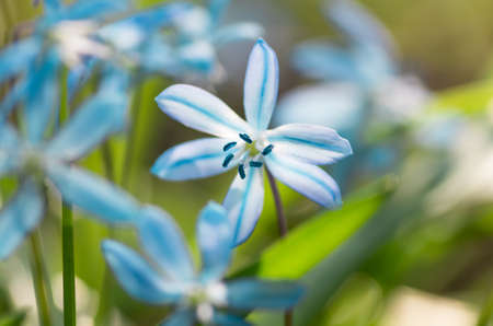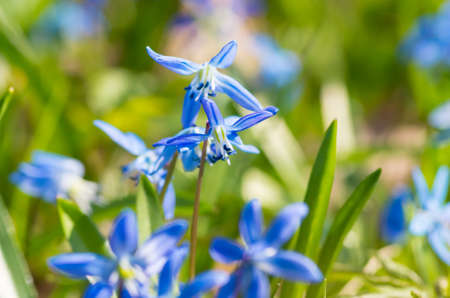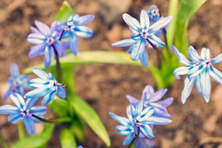 Blue blossom flower spring snowdrops Scilla Squill Soft focus. nature background.