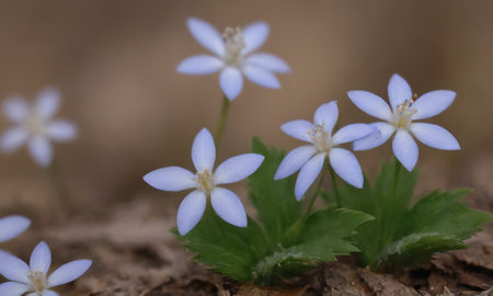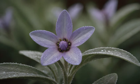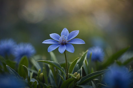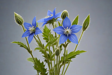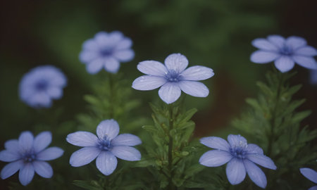 This image showcases delicate blue flowers with star-shaped petals, set against a backdrop of lush green leaves. The composition is close-up, emphasizing texture and detail. Soft lighting suggests an outdoor setting, potentially a garden or meadow. This image could be suitable for various commercial applications, including editorial and design projects.