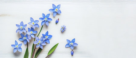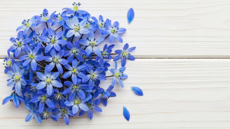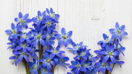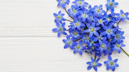 Top view blue Scilla flowers on white wooden background with space for text. First spring flowers. Greeting card for Valentine's Day, Woman's Day and Mother's Day.