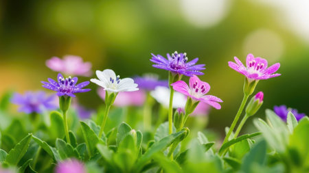 Purple and white flowers in a spring meadow in early morning summer rays. Lush green and purple.