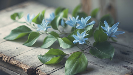 AI Generated. Lush green leaves and delicate blue flowers on weathered wooden surface
