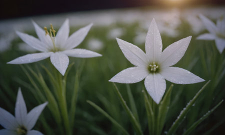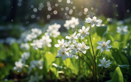 Generative AI : Small cute fresh white flowers in a spring field on nature in green and yellow tones in the rays of sunlight with soft focus closeup macro