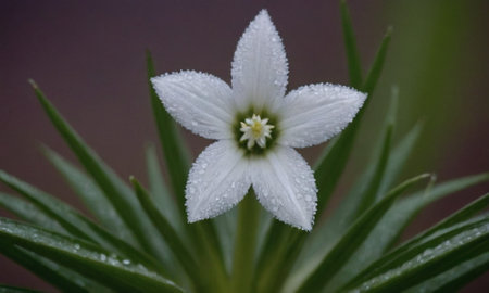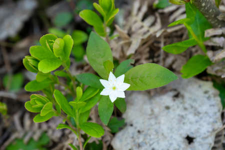 arctic starflower. Seven petalled white forest flower. forest vegetation. Spring forest background. White flower in the spring forest