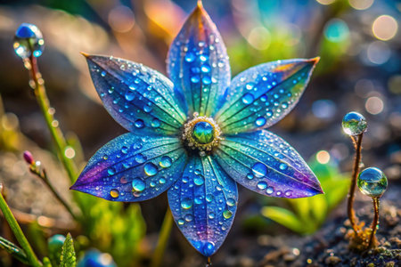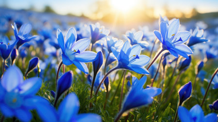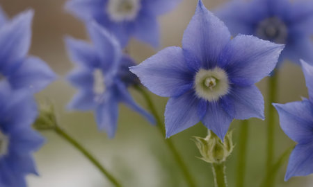 This image showcases a close-up of several striking blue flowers with star-shaped petals. The flowers are set against a soft, blurred background with green foliage and stems. The composition uses natural light. The photograph could be used for various commercial projects related to nature or design.