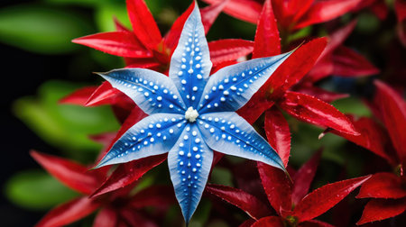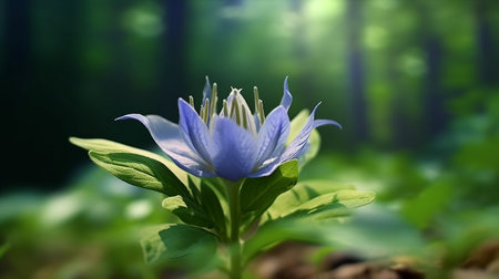 A stunning blue flower emerges from a lush backdrop of green leaves, highlighting nature's beauty and tranquility. Perfect for nature-related themes.