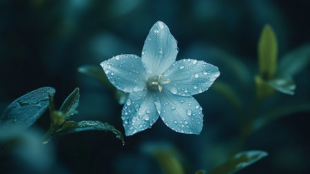 A close-up of a pale bluebell flower with water droplets on its delicate petals, surrounded by fresh greenery.