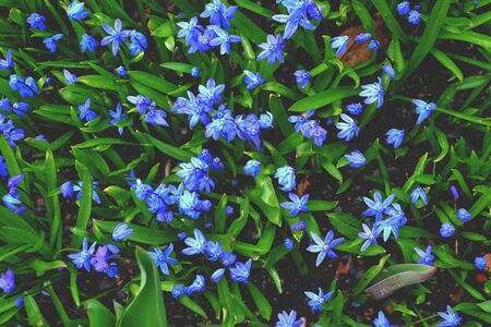 Spring floral background of blue Scilla flowers (Siberian squill, sapphire star, wood squill) blooming in April