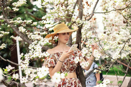 A girl stands near a flowering dogwood tree and poses, taking photos of flowers on her phone, smartphone. Spring composition.