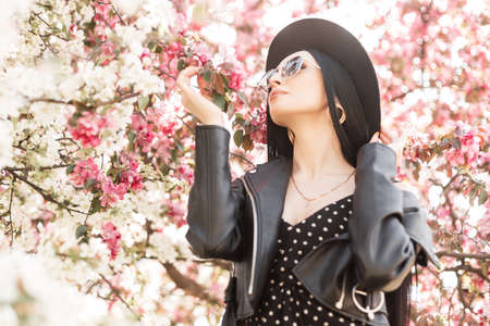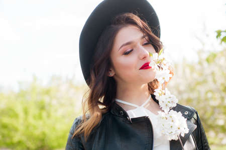 Lovely young girl in a black hat and a fashionable black leather jacket in spring in a blooming cherry garden in sunny weather with a blooming cherry branch in her hands. Spring and Fashion