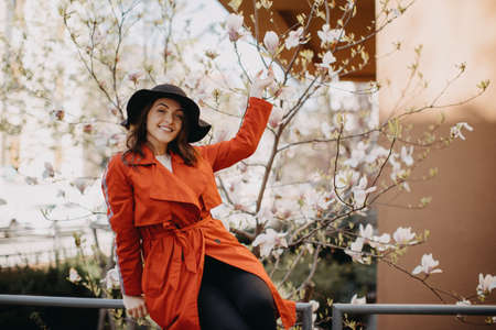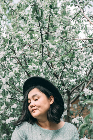 Young brunette woman in hat and dress near a white blooming tree. Generation Z girl enjoy spring mood during sunny day. Selective focus, copy space