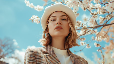 Stylish female model in a trendy spring outfit, featuring a white beret, captured in a fashionable outdoor scene