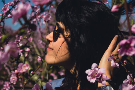 A young woman gazes serenely through delicate cherry blossoms during a sunny afternoon in spring