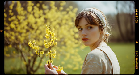 Young woman with curly hair wearing a beige shirt, surrounded by colorful flowers, representing beauty and nature, evoking a sense of tranquility and positivity