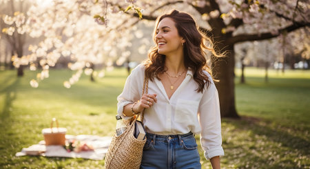 beautiful happy young woman with bag looking away in blooming park
