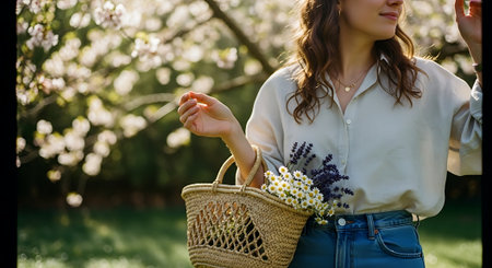 Cropped image of young woman holding basket with flowers in blooming garden