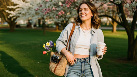 beautiful smiling young woman holding coffee cup and bag with flowers in park