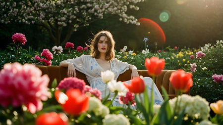 Beautiful young woman sitting on a sofa in the garden with tulips