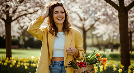 A smiling young woman in a yellow blazer holds a basket of colorful tulips, standing amidst blooming trees and vibrant yellow flowers in a sunny park.