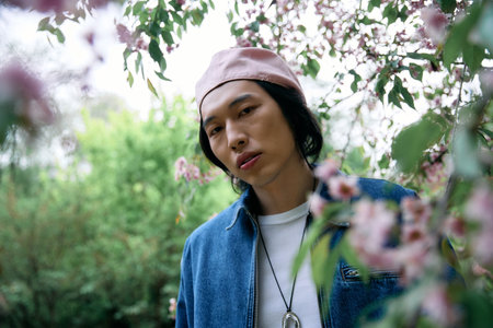 A young man showcases his fashionable denim look surrounded by beautiful blossoms in a park.