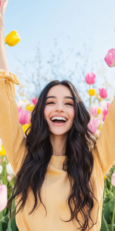 Joyful Woman Celebrating in a Vibrant Tulip Field Under Sunny Skies.