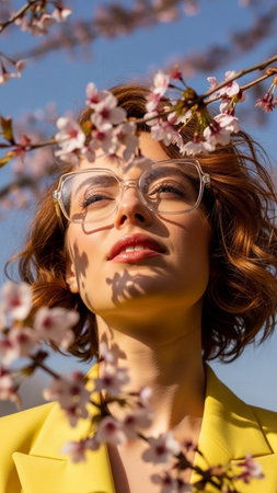 Beautiful Young Woman in Glasses and Yellow Blazer Posing Among Blooming Cherry Blossoms on a Sunny Spring Day