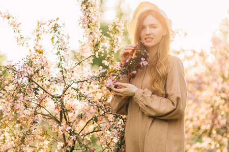 Young brunette woman in hat and dress in white pink blooming tree. Generation Z girl enjoy spring mood during sunny day. Springtime blossom. Selective focus, copy space