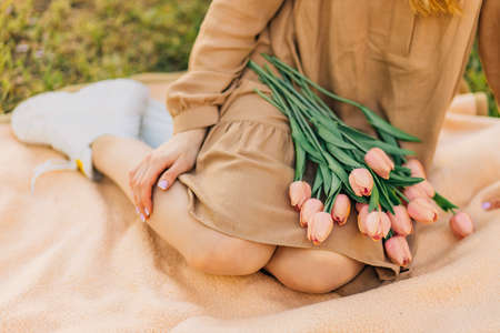 Beautiful smiling young woman, with a bouquet of tulips, on the lawn in the park, on a summer sunny day, enjoying nature