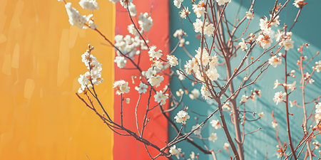White Blossoms Blooming on a Tree Branch Against Colorful Wall