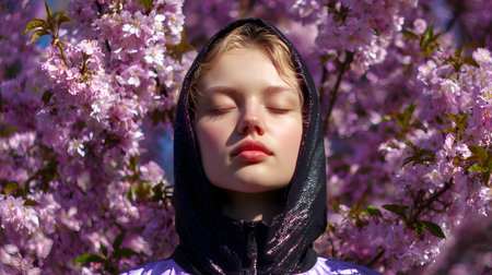 Portrait of a beautiful girl with closed eyes in a black headscarf on a background of pink cherry flowers