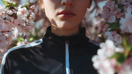 Close-up portrait of a faceless girl in a black sports jacket against the background of blooming cherry trees