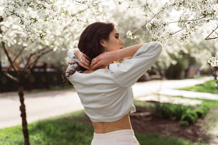 Pretty teen girl are posing in garden near blossom cherry tree with white flowers. Spring time