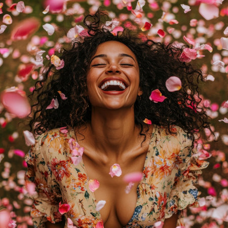 A joyful woman with curly hair laughs exuberantly as flower petals cascade around her in a lush outdoor environment. Bright colors and a carefree atmosphere embody happiness.